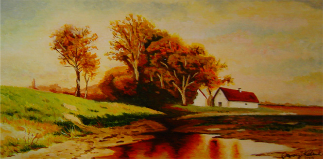 80x35 cm Farostlemezre temperával Cím: Tanya pocsolyával (Farm with puddle) 40000 Ft |